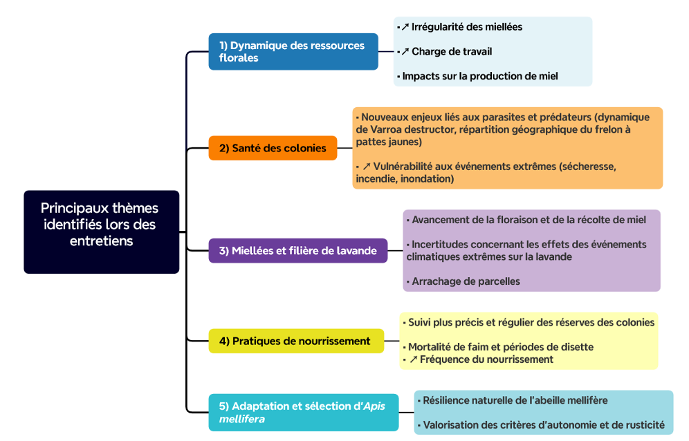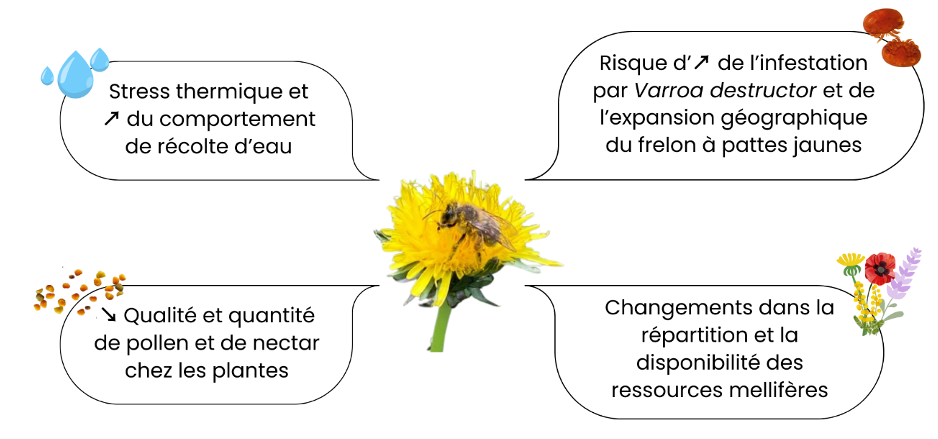 Ces effets se répercutent sur l’apiculture, en altérant la disponibilité et la répartition des ressources florales dont dépend A. mellifera [9], ainsi qu’en influençant la santé des colonies via l’activité des bioagresseurs et l’occurrence d’événements météorologiques extrêmes.