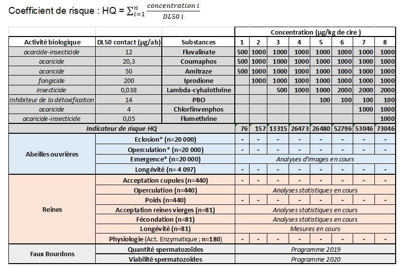 Huit mélanges de pesticides et de médicaments vétérinaires couramment retrouvés dans la cire ont été sélectionnés afin de composer le gradient d’exposition.
