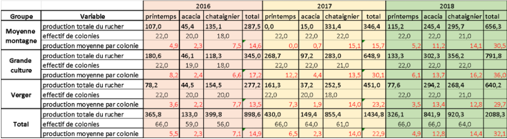 Les données recueillies au cours des saisons 2016 à 2018 par l’équipe de l’ADA-AURA nous ont d’abord permis de décrire et d’étudier quelles étaient les dynamiques populationnelles, l’état de santé des colonies et les quantités de miel produites par celles-ci pour chacun des parcours (Tableau ecotox 1).